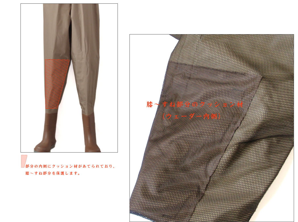 丈夫です。ヒザからスネ部分の内側には、1mmほどの厚さのクッション材で補強されており深場の立ち込み、水場での野外活動。荒っぽい扱いにも耐えます。