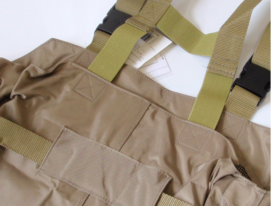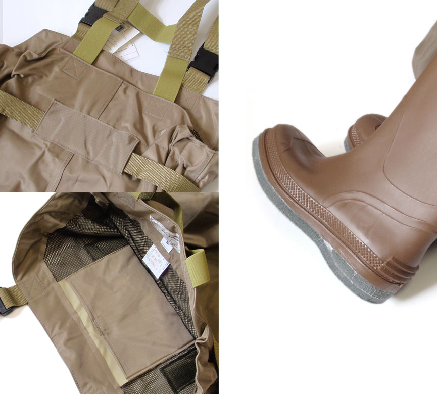 強靭な420デニールナイロンによるウェーダーです。ウエストタイプになります。フェルト底になっています。ヒザ〜スネ部分の内側にはクッション素材で保護されています。