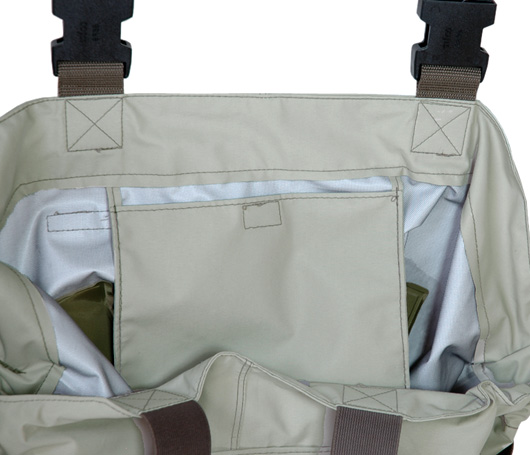 強靭な420デニールナイロンによるチェストウェーダーです。フェルト底になっています。ヒザ〜スネ部分の内側にはクッション素材で保護されています。